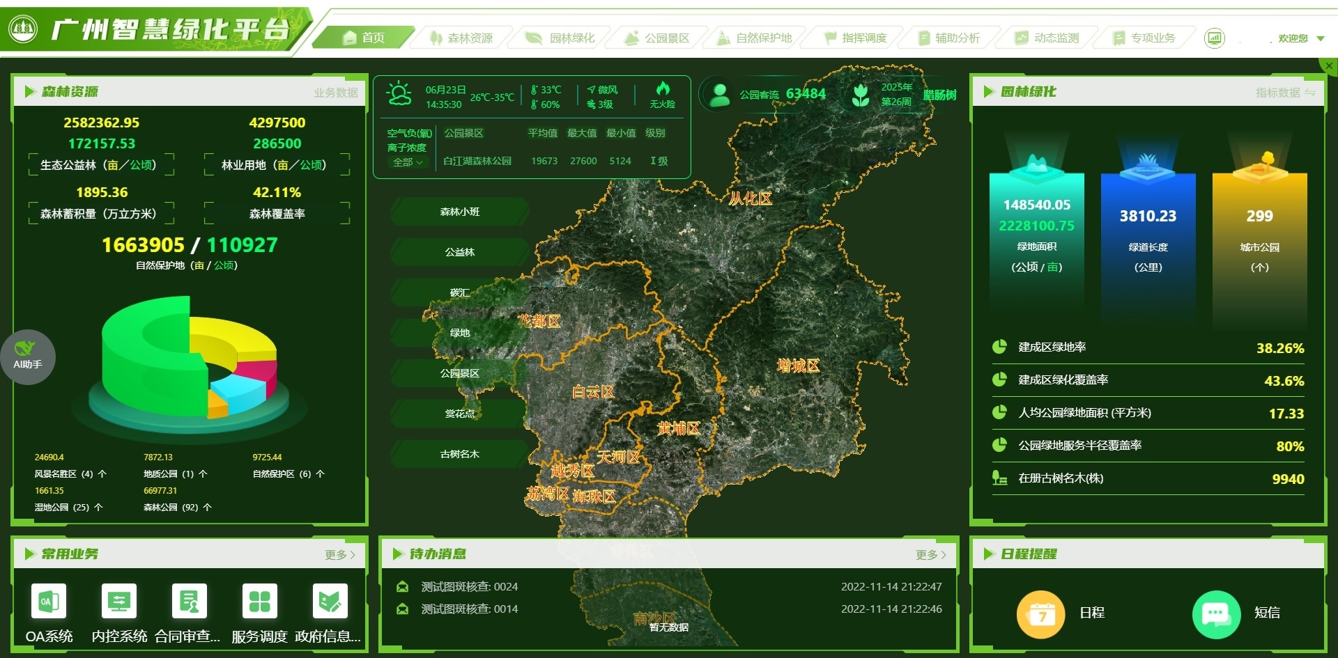 由广州市林业和园林局主导建设的广州智慧绿化平台,深度融合林业园林业务,构建了覆盖全市的“一张图”数字化管理体系。在业务支撑方面,平台深度整合了11大类、近1000万条数据,实现了39个关键业务系统的互联互通,服务用户超5000人。在技术方面,依托国产化技术,实现资源可视化和管理智能化。通过接入视频监控、物联感知设备并引入AI助手,实现深度分析数据,为管理决策提供支撑。在智慧公园管理方面,平台覆盖15个公园,游客满意度达96%,服务响应效率提升40%,每年服务市民超200万人次。智慧绿化建设新模式为全国林业园林的智能化管理提供了“广州样本”。